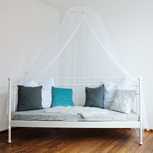 Praktisches Moskitonetz für unterwegs und ideal für den Abenteuerurlaub. Für einen insektenfreien Schlaf im Outdoor- oder Indoorbereich. Auf Reisen oder zu Hause kann der Insektenschutz leicht über dem Bett oder dem Schlafplatz aufgehängt werden. Der Insektenschutz wiegt nur 300g und wird im praktischen Transportbeutel mit Aufhängeset geliefert und ist einfach zu verstauen. Das qualitativ hochwertige Netz besteht aus leichtem, aber strapazierfähigen 100% Polyester, der schön fällt und unbeschichtet ist. Durch seine selbstaufrichtende Form mit Hilfe der auffächerbaren Holzspinne bietet das Moskitonetz ein besonders kleines Packmaß. Die Maschenweite wird in mesh per square inch angegeben, je größer die Einheit, desto feiner ist das Moskitonetz. Je dichter die Maschen sind, umso zuverlässiger ist der Schutz gegen kleine Insekten wie Sandfliegen. Der Nachteil liegt hier in einer geringeren Luftzirkulation. Laut Weltgesundheitsorganisation (WHO) wird für Malaria-Gebiete eine Maschenweite bei unbeschichteten Moskitonetzen von mindestens 156 sq, gegen Sandfliegen mindestens 196 sq empfohlen.Rundes Moskitonetz für unterwegs mit Eingang